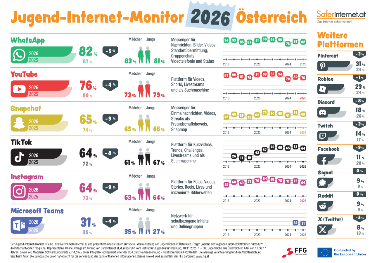 Quelle: https://www.saferinternet.at/presse-detail/jugend-internet-monitor-2026-deutlicher-rueckgang-der-social-media-nutzung-durch-jugendliche